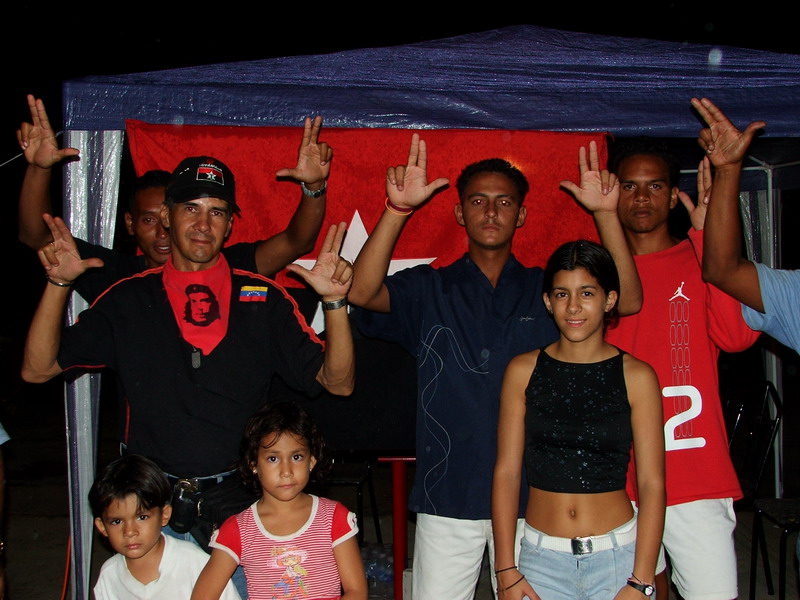 Наш друг Кармело Гарсиа везет нас к «Тупамаро». Еще днем мы общались с представителями этого полувоенного движения из числа волонтеров фестиваля. Вечером на агитационном посту городских партизан, под флагом республики и красно-черным, со вписанной в звезду буквой «Т», знаменем, сидит с десяток молодых людей. Это они разъезжали по городу на машинах. Их командир, Хосе Луис Почано носит звание полковника – «коронеля», имеет знаки различия, бесспорный авторитет у своих людей и хорошо поставленную речь политического оратора. Он руководит всеми тупамарос в этом районе штата Миранда. Мы берем интервью, где он подробно рассказывает об истории движения, зародившегося в знаменитом баррио «23 января» в Каракасе. Жители бедных районов – сторонники Чавеса, начали объединяться в отряды для силового отпора контрреволюции. Многие из них опирались на опыт подпольной борьбы против либеральных режимов, выплеснувшейся в кровавом восстании «Caracazo» 27 февраля 1989 года и выступлении чавистов 4 февраля 1992-го. Именно поэтому они с гордостью называют себя «городскими партизанами». Их деятельность включает в себя организацию массовых уличных акций, борьбу с провокаторами, саботажниками, правыми алькальдами, «золотой молодежью» богатых кварталов (Хосе Луис зовет их одним словом: «фашисты»), разъяснительную политическую работу среди масс, борьбу с наркобизнесом, которая включает в себя ликвидацию кокаиновых дельцов – чем особенно славятся тупамарос. Здороваясь и прощаясь, они по-рэпперски бьют кулаком о кулак, произнося слово «Фуэрса!» – сила.