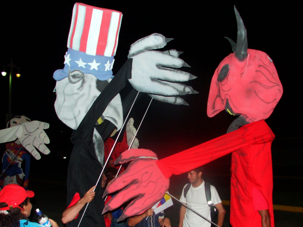 «Чавесу приходится крутиться, как на сковородке», – говорили нам венесуэльцы. После выступления на Площади Чести он успел слетать с визитом в Уругвай, к Табаре Васкесу, предложить североамериканским кабельщикам льготные цены на бензин в обмен на продвижение «Телесура» в США, выдвинуть новые социальные инициативы. А затем вернулся для четырехчасового выступления на форуме в рамках Антиимпериалистического трибунала. CNN сутками крутило кадры с непосредственно прыгающим на сцене Чавесом (видимо, в США находят их комичней ужимок Буша). Жаль, что они опустили все остальное. Чавес говорил: когда разгорелась забастовка, и страна осталась без привычного горючего в баллонах – обычного топлива бедняков, он, обессиленный, вышел на улицы, где его узнала и затащила к себе домой жительница баррио. Она показала ему свою лачугу, больного мужа, детей, и картошку, которую жарила им на ужин. «Если ты ничего не можешь сделать – становись, жарь мою картошку. А если можешь – иди и сделай», – сказала она президенту (и этому надо верить, даже если женщина существовала лишь в его воображении тех лихорадочных дней). Чавес – сделал. Бастовавшие танкеры были захвачены армией, фарватер озера Маракайбо раскупорен для судоходства. Тогда это казалось чудом – не очень божественным в глазах клерикальной оппозиции, один из лидеров которой, кардинал Розалио Кастильо, как раз накануне фестиваля призвал подвергнуть президента экзорцизму. Сам Чавес ищет дьявола в других местах. В радиопрограмме «Алло, президент!» он просто и доходчиво назвал социализм раем, а капитализм – адом (для тех венесуэльцев, кто еще верит клерикальной пропаганде). Во время референдума Чавес активно использовал легенду о народном певце Флорентино, хитростью перепевшем на состязании самого дьявола. Один из самых популярных чавистских плакатов, по существу – лубок, изображает президента в военном камуфляже, рядом с рисованным портретом Че. Под ними, в волнах адского пламени горят переодетый Гитлером Джордж Буш и с десяток оппозиционных политиканов. «Флорентино или дьявол. Социализм или Ад» – написано на этом плакате. Церковники могут еще десять раз проклясть Чавеса, но их паства уже знает, что ждет их за вывеской рая неолиберализма. Вряд ли она подарит святым отцам и их спонсорам чудо возвращения к старым порядкам. Авторитет этой публики на нуле – и Чавес уже может позволить себе прямо назвать кардинала Кастильо «бандитом». И даже не оправдывается от его обвинений в «одержимости». На Антиимпериалистическом трибунале он цитировал Кастро, который как-то сказал Чавесу: «Раньше я был у них одним дьяволом. Теперь они сделали из тебя второго. Вдвоем нам будет полегче».