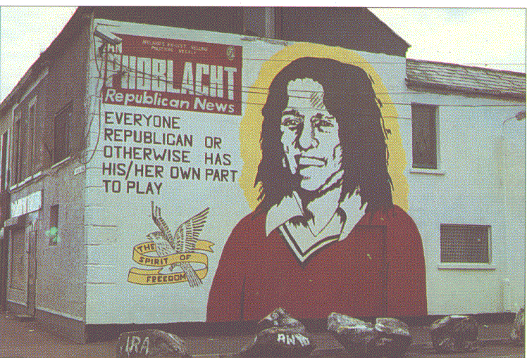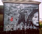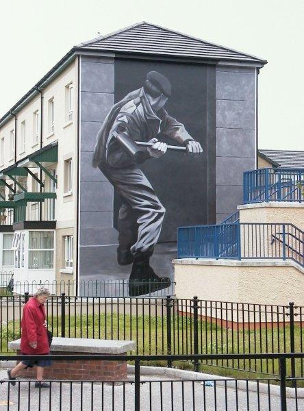 Республиканские граффити явно выигрывают в войне рисунков, а эта война - отражение вооруженной борьбы между Ирландской Республиканской Армией, гражданским населением католических гетто и правыми боевиками-протестантами, поддержанными королевской полицией (Это религиозное разделение лишь по традиции обозначает разделение политических сил; в рядах ИРА воюет немало протестантов). Уличные бои с констеблями и армейскими частями, баррикады, стрельба из снайперских винтовок и гранатометов, взрывы, аресты, побои и пытки. Не такое далекое прошлое, во многом - настоящее Ольстера. На этом сопротивлении выросли целые школы высокохудожественной политической мурали. Особенно известна группа "Художники Бугсайда" из Свободного Дерри, чьи работы посвящены мужественной обороне ирландской общины этого города - с 60-х годов и до наших дней*.