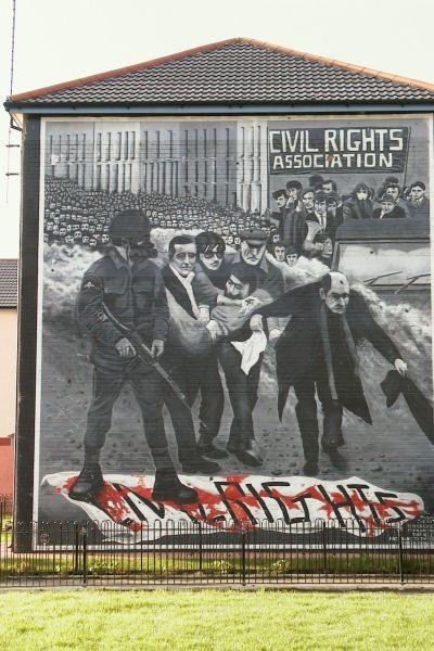 Дети - жертвы пластиковых пуль королевской полиции, павшие мужчины и женщины, бойцы ИРА, смотрят со щитов и кирпичных стен, ожидая, когда их родина станет свободной - впервые, за последние сотни лет. Граффити гетто протестуют против расистских "парадов" ордена оранжистов, практикующих ежегодные шествия через кварталы ирландцев, в знак многовекового господства над их народом.