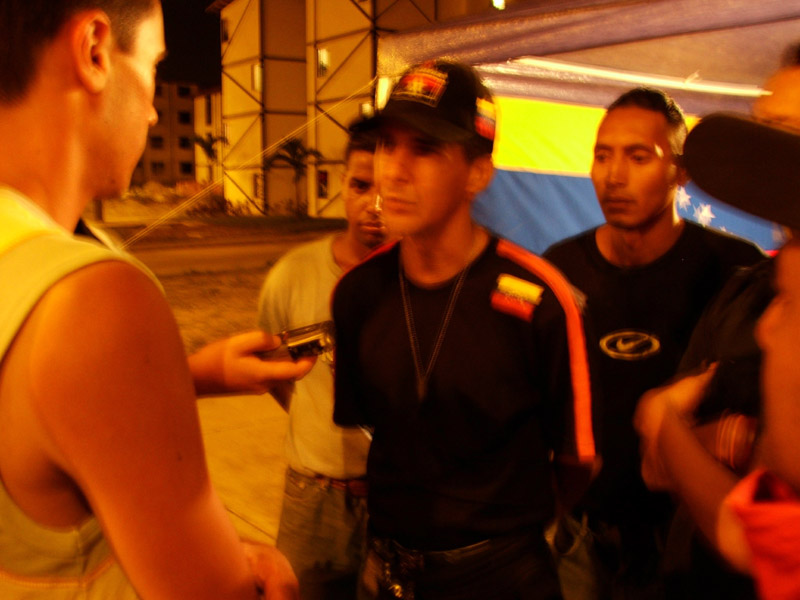 Наш друг Кармело Гарсиа везет нас к «Тупамаро». Еще днем мы общались с представителями этого полувоенного движения из числа волонтеров фестиваля. Вечером на агитационном посту городских партизан, под флагом республики и красно-черным, со вписанной в звезду буквой «Т», знаменем, сидит с десяток молодых людей. Это они разъезжали по городу на машинах. Их командир, Хосе Луис Почано носит звание полковника – «коронеля», имеет знаки различия, бесспорный авторитет у своих людей и хорошо поставленную речь политического оратора. Он руководит всеми тупамарос в этом районе штата Миранда. Мы берем интервью, где он подробно рассказывает об истории движения, зародившегося в знаменитом баррио «23 января» в Каракасе. Жители бедных районов – сторонники Чавеса, начали объединяться в отряды для силового отпора контрреволюции. Многие из них опирались на опыт подпольной борьбы против либеральных режимов, выплеснувшейся в кровавом восстании «Caracazo» 27 февраля 1989 года и выступлении чавистов 4 февраля 1992-го. Именно поэтому они с гордостью называют себя «городскими партизанами». Их деятельность включает в себя организацию массовых уличных акций, борьбу с провокаторами, саботажниками, правыми алькальдами, «золотой молодежью» богатых кварталов (Хосе Луис зовет их одним словом: «фашисты»), разъяснительную политическую работу среди масс, борьбу с наркобизнесом, которая включает в себя ликвидацию кокаиновых дельцов – чем особенно славятся тупамарос. Здороваясь и прощаясь, они по-рэпперски бьют кулаком о кулак, произнося слово «Фуэрса!» – сила.