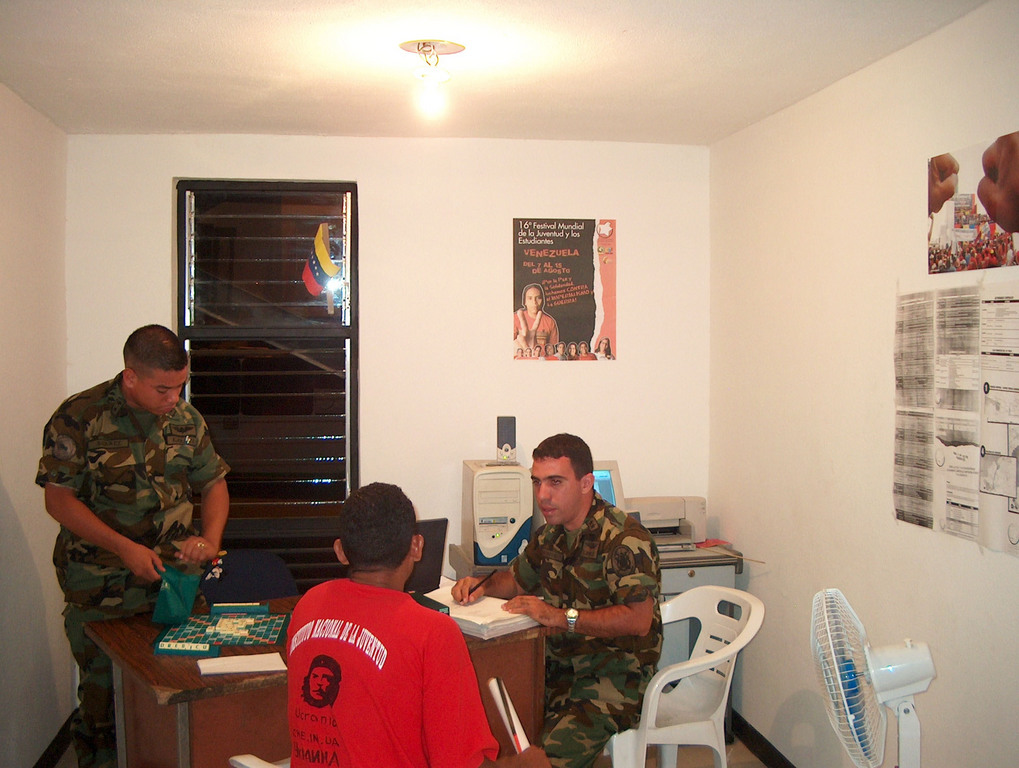 Мы общаемся с молодыми лейтенантами-теньентес, среди которых одна девушка-офицер, и их командиром, капитаном гвардии. Все они вооружены штурмовыми винтовками бельгийского производства (обижаются, когда мы приняли это оружие за американское), все отлично экипированы, держатся уверенно, с достоинством, и даже этим очень не похожи на украинских и российских военнослужащих. Все – открытые сторонники президента Чавеса и цитируют боливарианскую конституцию 2000 года. Подчеркивают, что она предусматривает широкое участие населения в управлении страной. Солдаты верят в Боливарианскую революцию, верят в социальные реформы, и очень довольны, что им приходится защищать образовательные и медицинские программы, а не трон кучки олигархов, как это делают их коллеги в большинстве стран. Кроме того, им хорошо платят, их уважают друзья и боятся враги – и это также вызывает у солдат немалое удовлетворение. Им очень нравятся фестиваль и его гости. Общение между нами завязалось уже в первые часы приезда в Миранду, разговорами о перевороте 2002 года. Даже самые молодые ребята в камуфляже подчеркивали роль армейских масс в его ликвидации. Впрочем, армии приходится вступать в бой и сегодня. Против сил, которые не прекращают атаковать ее в подконтрольных буржуазии СМИ, а по ночам стреляют в солдат из-за угла. Этим камуфлированным мальчикам приходится иметь дело с опытными военно-политическими диверсантами империализма. Накануне в Венесуэлу проникли пять сотен профессиональных агентов, подготовленных колумбийским филиалом ЦРУ. Надо надеяться, что солдаты Чавеса возьмут над ними верх.