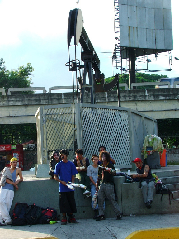 Воздух пахнет дешевым бензином, 150 боливаров (4 цента) за литр, и горелым мусором (враждебный Чавесу алькальд одного из муниципалитетов саботирует его утилизацию). В воздухе – рев огромного стада мотоциклов и машин (от старых кадиллаков гангстерской эпохи до новеньких внедорожников, жрущих дармовое топливо), поп-хит «Газолина», свистки активистов, бой барабанов, политические речевки. В воздухе – нестабильность, дыхание больших перемен, которые пришли сюда шесть лет назад. То, что можно определить словами «боливарианская революция». Наступают быстрые тропические сумерки, и десятки тысячи огоньков барриос на склонах гор превращают Каракас в рождественскую елку. Мы переполнены впечатлениями, оглушены этим удивительным, грязным, но таким ярким городом, его особой урбанистической красотой. В нем столько бедности, и столько энергии, устремленной на развитие и борьбу. Бедняки-рабочие поднимаются к своим домикам, пьют пиво, перекидываются словами. На многих из них заметны цвета сторонников Чавеса – темно-красные, с оттенком густой человеческой крови. Толпы детей гоняют мячи и просто стоят у бетонных стен. Впервые за много поколений у них появился шанс на другое будущее, и можно надеяться, что они понимают это сами.