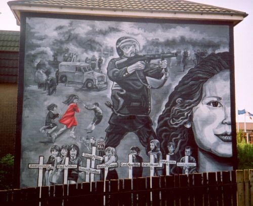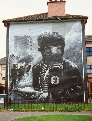 Республиканские граффити явно выигрывают в войне рисунков, а эта война - отражение вооруженной борьбы между Ирландской Республиканской Армией, гражданским населением католических гетто и правыми боевиками-протестантами, поддержанными королевской полицией (Это религиозное разделение лишь по традиции обозначает разделение политических сил; в рядах ИРА воюет немало протестантов). Уличные бои с констеблями и армейскими частями, баррикады, стрельба из снайперских винтовок и гранатометов, взрывы, аресты, побои и пытки. Не такое далекое прошлое, во многом - настоящее Ольстера. На этом сопротивлении выросли целые школы высокохудожественной политической мурали. Особенно известна группа "Художники Бугсайда" из Свободного Дерри, чьи работы посвящены мужественной обороне ирландской общины этого города - с 60-х годов и до наших дней*.