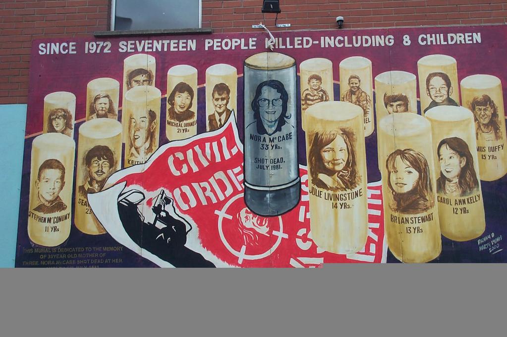 Дети - жертвы пластиковых пуль королевской полиции, павшие мужчины и женщины, бойцы ИРА, смотрят со щитов и кирпичных стен, ожидая, когда их родина станет свободной - впервые, за последние сотни лет. Граффити гетто протестуют против расистских "парадов" ордена оранжистов, практикующих ежегодные шествия через кварталы ирландцев, в знак многовекового господства над их народом.